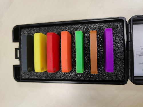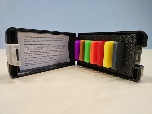 АВМ ША Комплект мер твердости по Шору А предназначен для контроля исправности и точности показаний переносных и стационарных твердомеров резин и пластмасс по шкале твёрдости Шора тип А (HA)